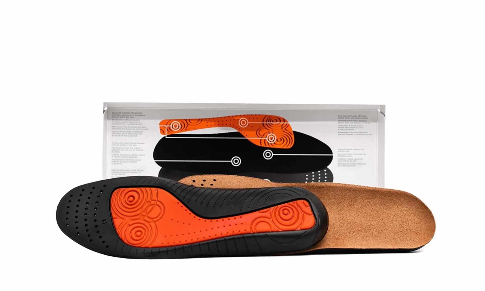 The BAMA Balance Comfort insole has a special air chamber system that noticeably reduces pain in the sensitive heel and ball area. The anatomically shaped footbed improves hold and stability in your shoes. A comfortable, moisture-absorbing velor cover and the perforations allow air and moisture to be transported. The two-layer construction effectively absorbs shocks and reduces pressure, an integrated pad supports the metatarsal arch.