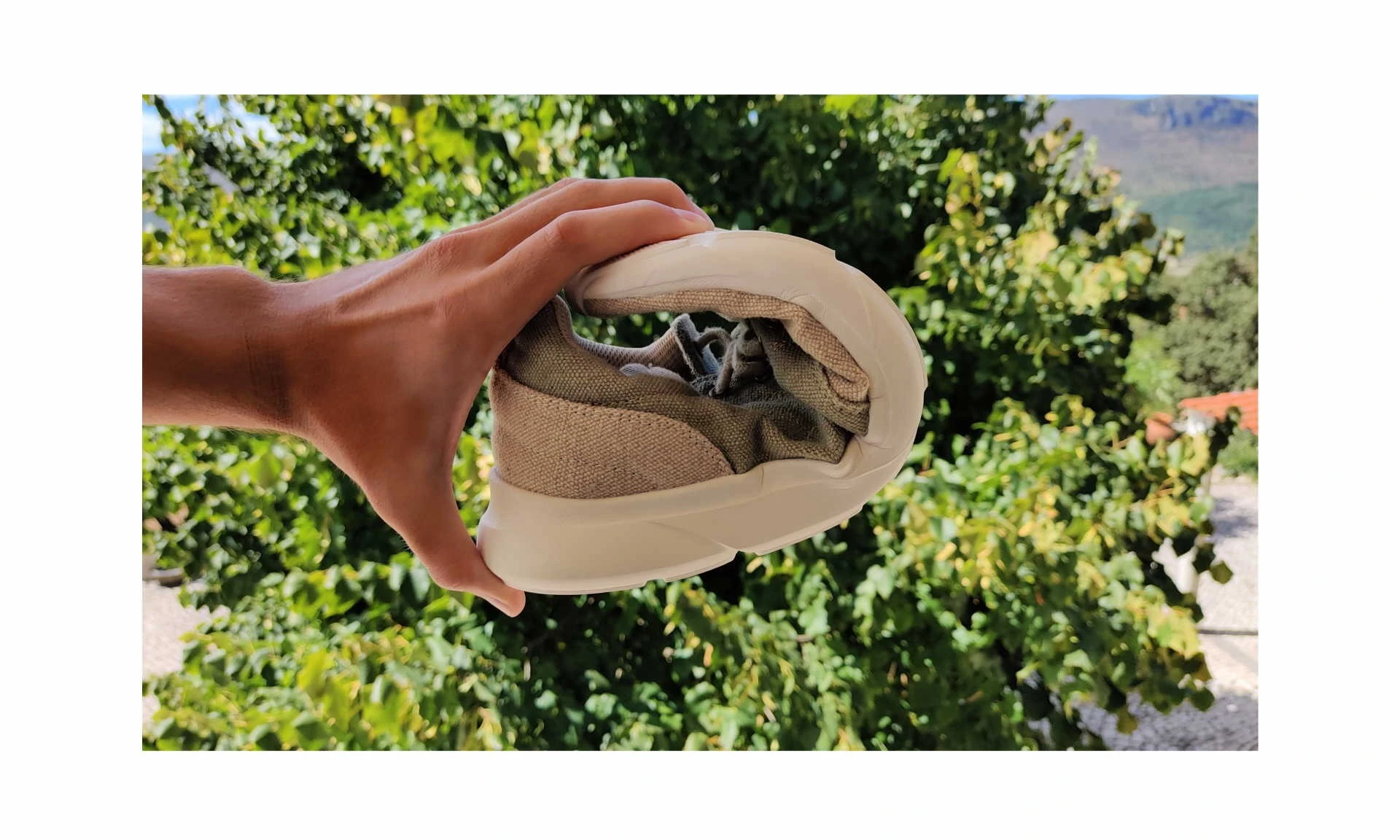 The shoe’s carbon footprint is 4.1 kg. The production of a conventional sports shoe generates on average about 14 kg of CO2 and that of an animal leather shoe can achieve up to 100 kg of CO2.