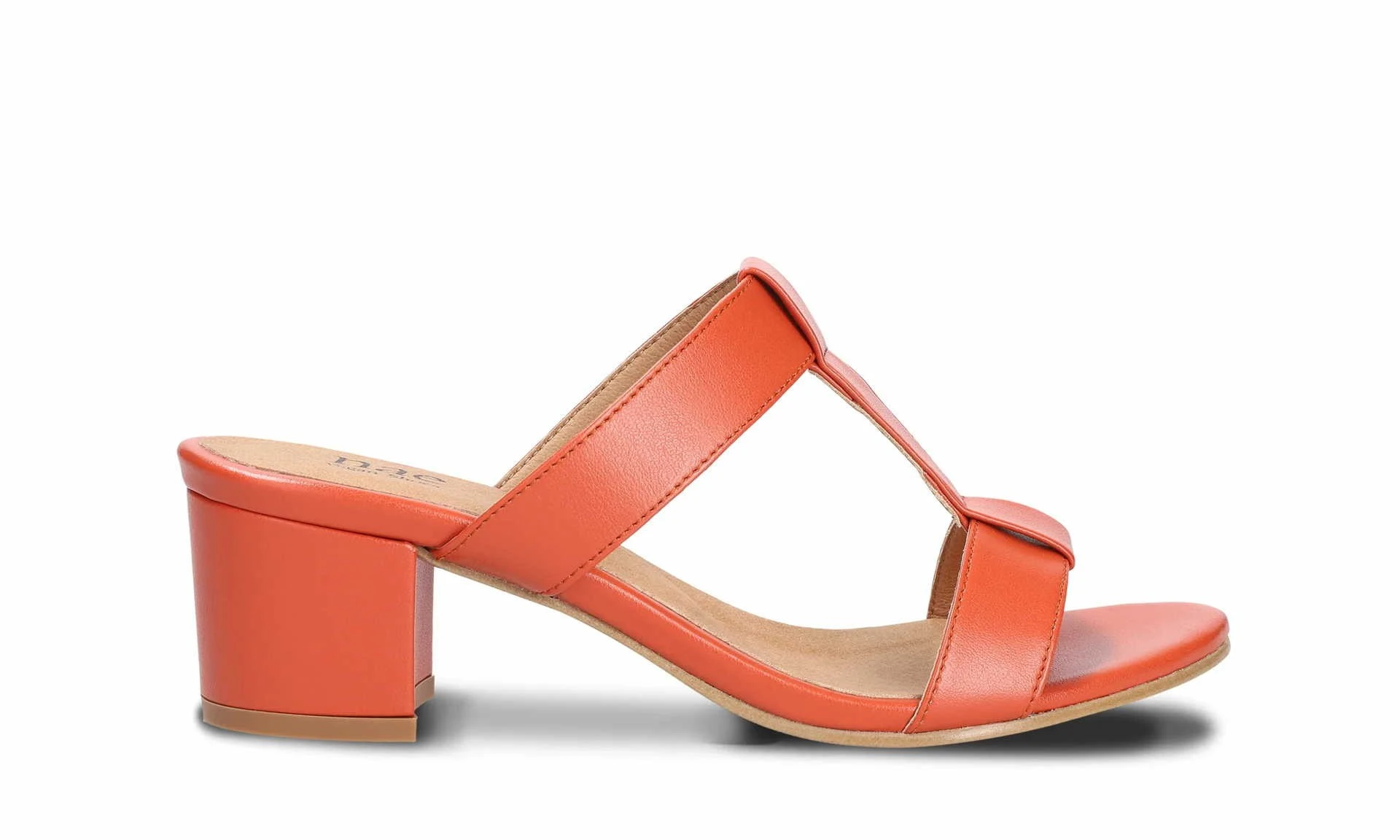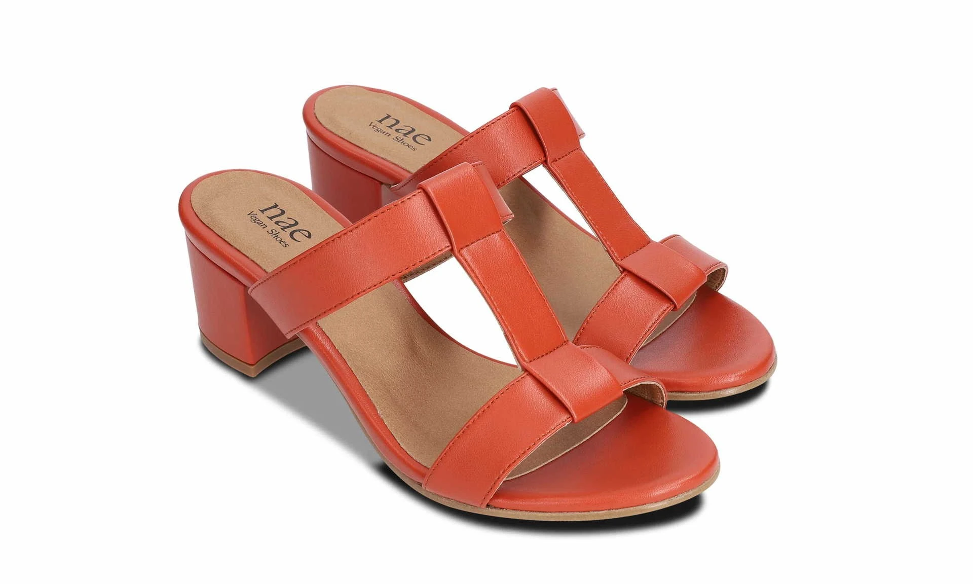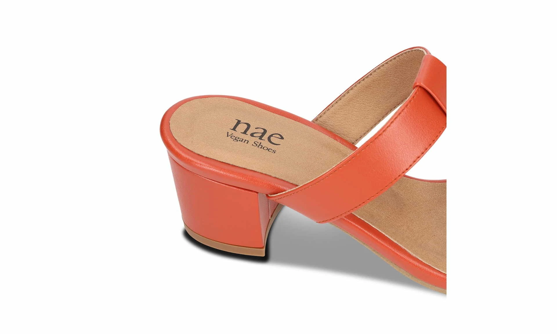 Iris Orange by nae is a vegan slider sandal with heel in a bright orange colour. Thanks to the T-shaped straps, the sandal sits comfortably on the foot. What makes Iris all the cooler is that it is made of vegan apple leather – a bio-based leather alternative that uses leftovers from the apple juice industry from Italy!