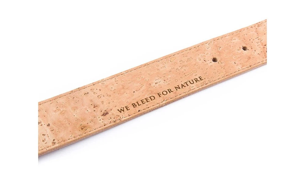 The Cork Belt by BLEED is a robust, sustainably produced belt made from waste paper and cork. It is 3.5 cm wide. The BLEED logo along with the slogan “We bleed for nature” are delicately burned into the material. The Cork Belt is not only practical, but is also a real eye-catcher thanks to the unusual cork look.
