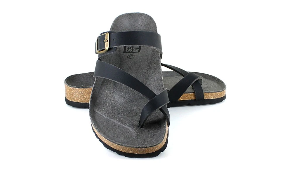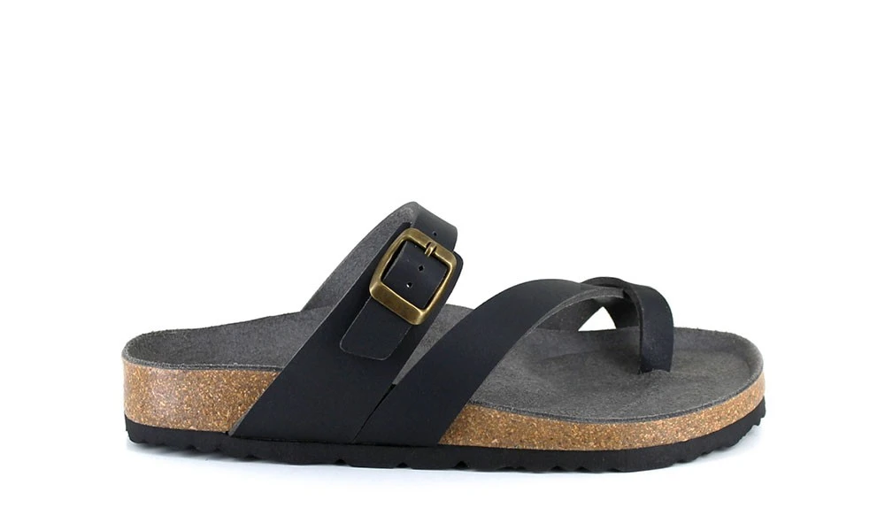 The Toe Strap Sandal by VEGETARIAN SHOES is a new and improved version of the popular Santorini Sandal. The straps are made from a breathable and supple synthetic leather, while the footbed is made from a darker suede-look microfibre, and the grippy sole is made from cork and rubber. All in all, the Toe Strap Sandal is a classic sandal that is perfect for warm days.