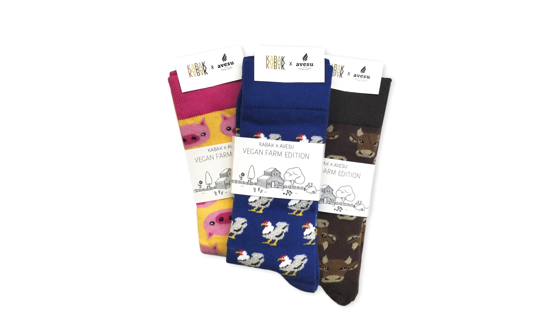 The vegan socks from the Vegan Farm Edition range are the result of a collaboration between AVESU and KABAK. These high-quality socks are made from 80% combed cotton and 20% synthetic fibers, ensuring optimal fit and excellent durability. The socks are machine washable up to 40°C. They are made to high standards and are real eye-catchers thanks to their colourful designs.